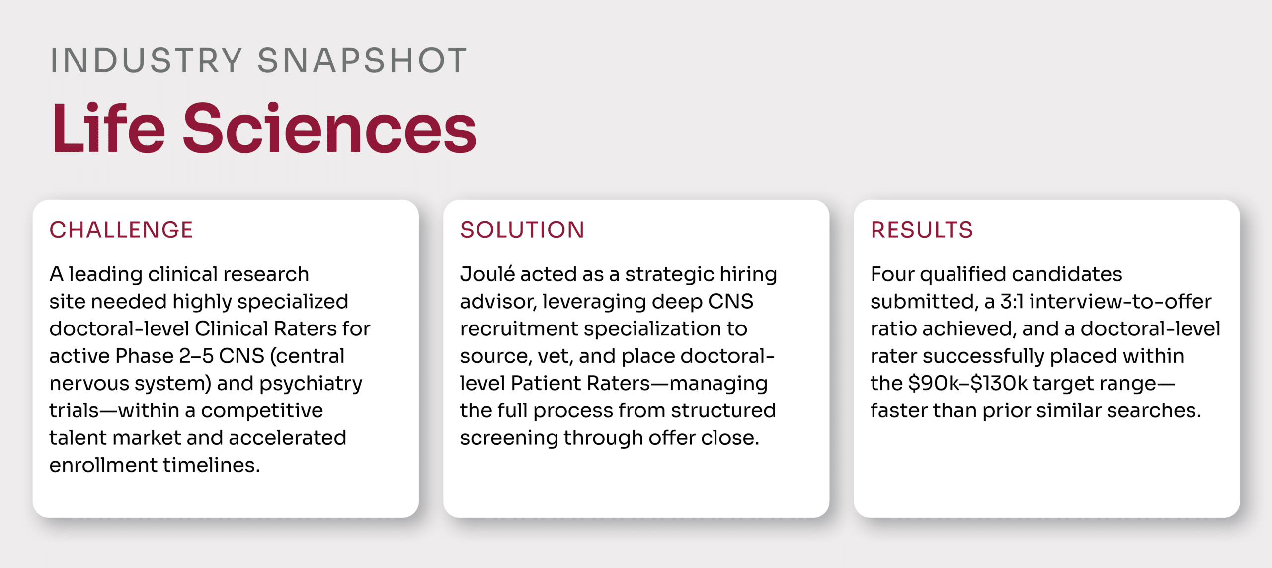Through close collaboration with leadership, Joulé translated complex clinical hiring criteria into a targeted talent strategy. The result was a streamlined hiring process that delivered four fully qualified candidates, achieved a strong interview-to-offer ratio, and successfully placed a doctoral-level rater within the desired compensation range. The placement directly supported active Phase 2–3 CNS trials, strengthening rating reliability and study continuity.